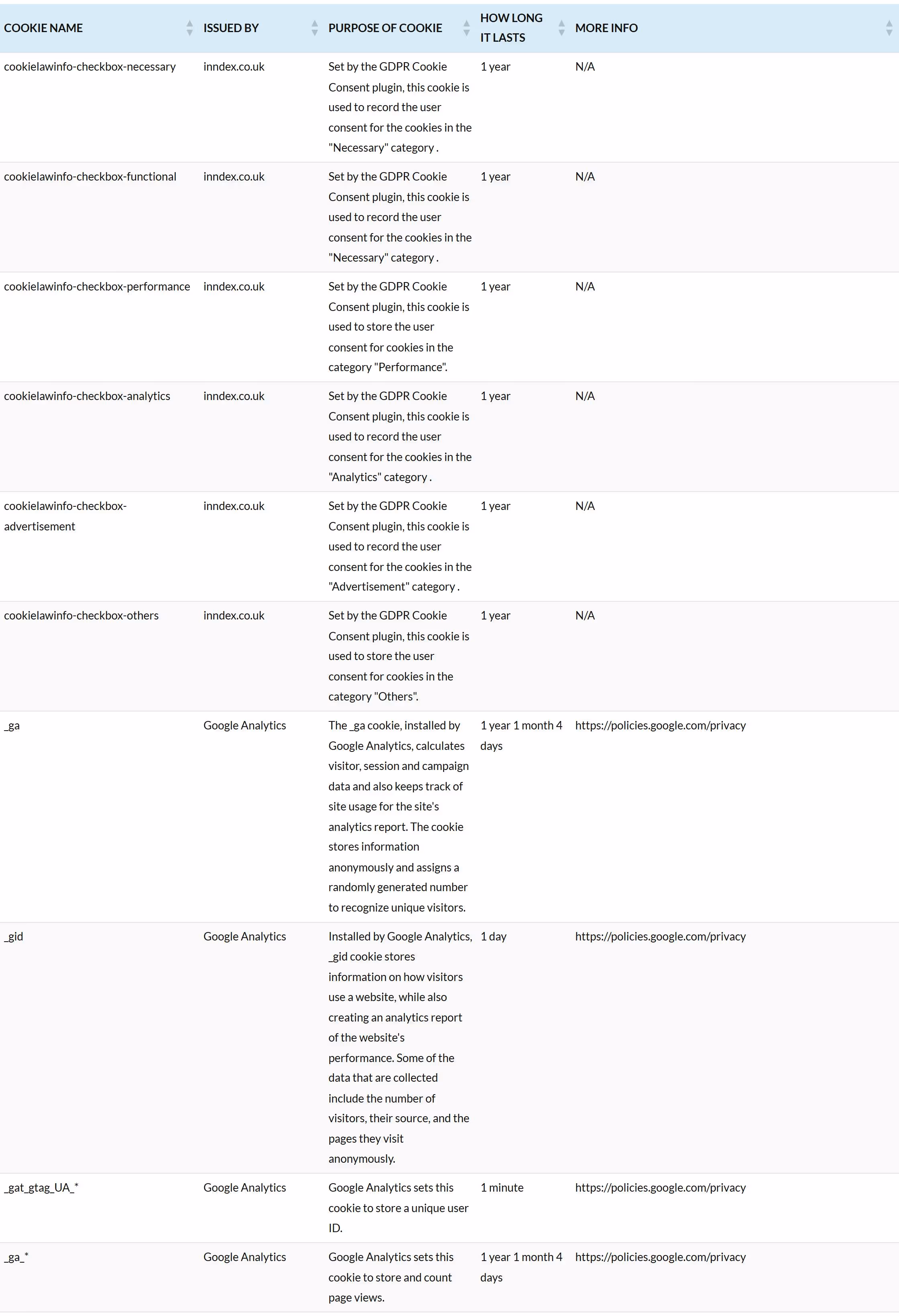You can find more information about the individual cookies we use, the purposes for which we use them, and how long they stay on your browser, in the table below.